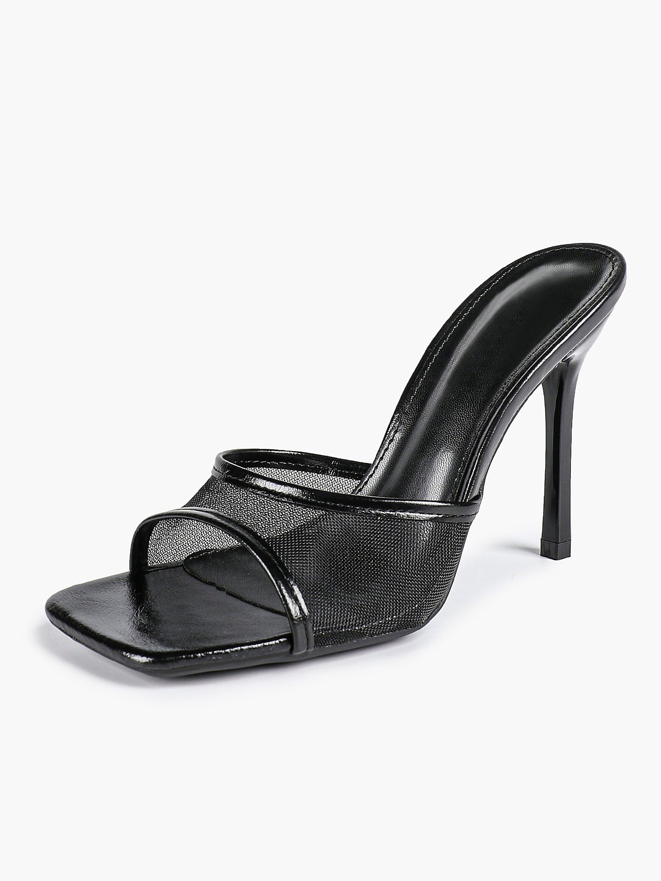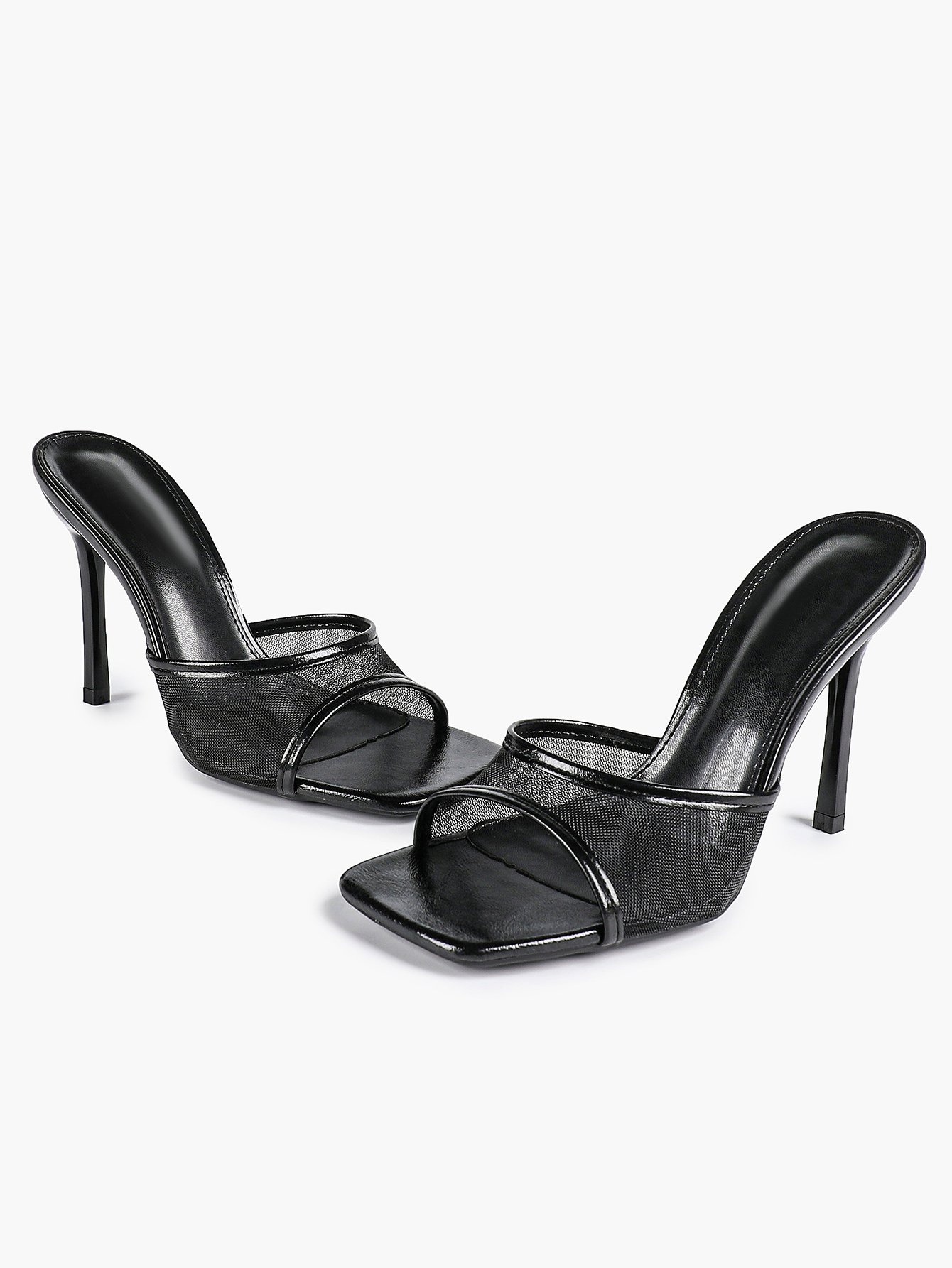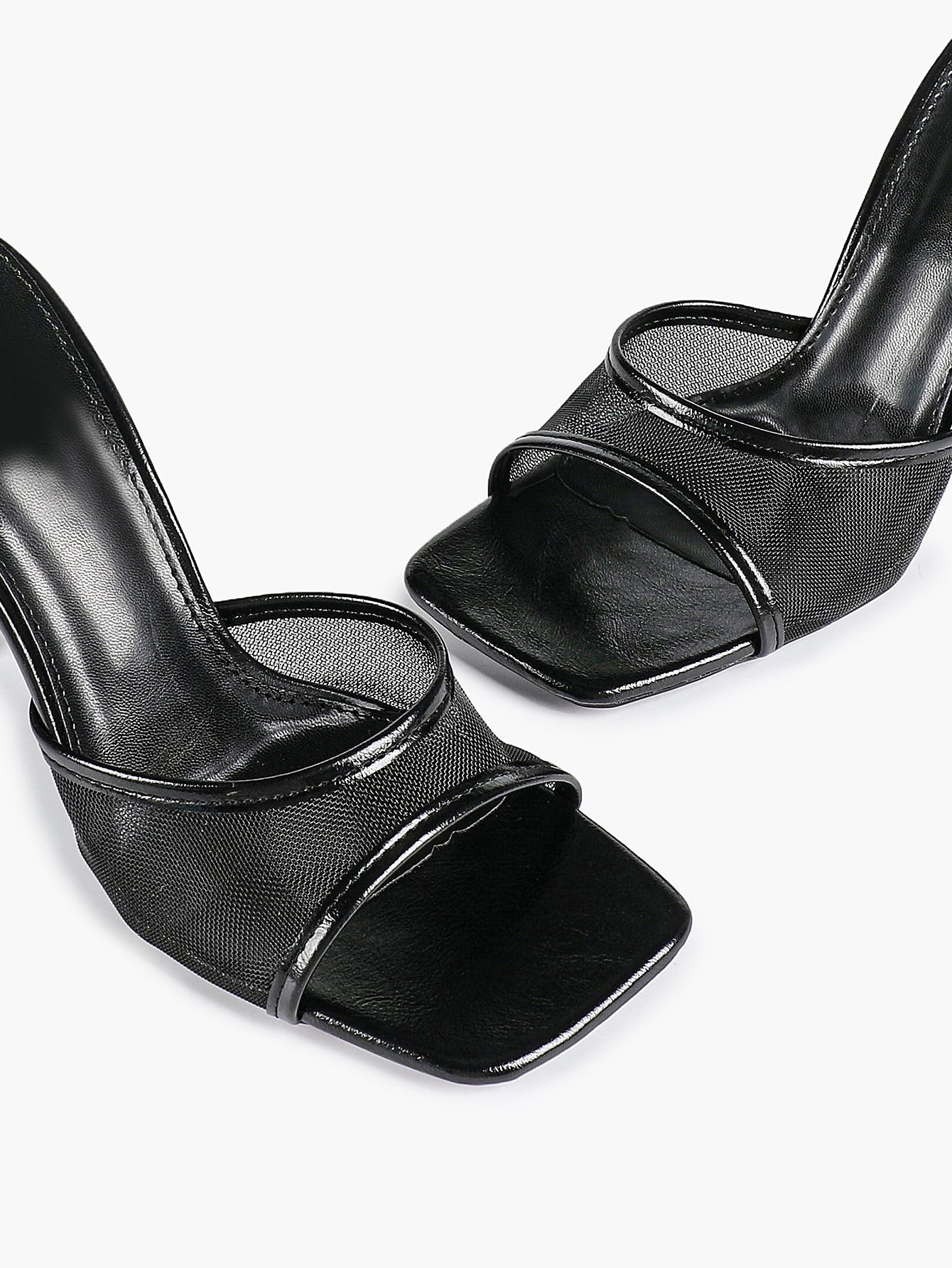Women Patent & Transparent Mesh Mule Sandals – Square Toe Stiletto Heels