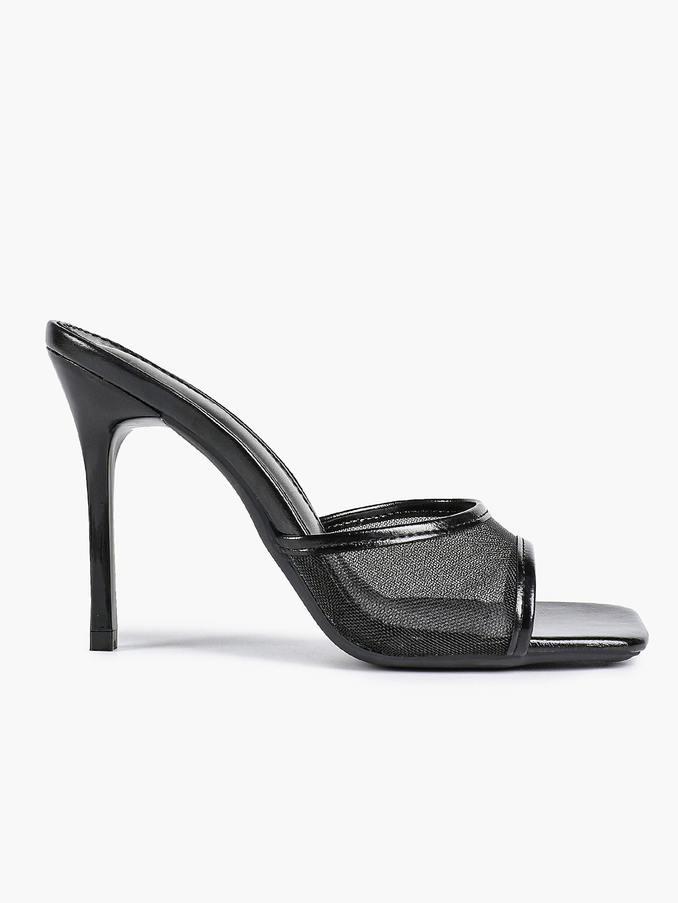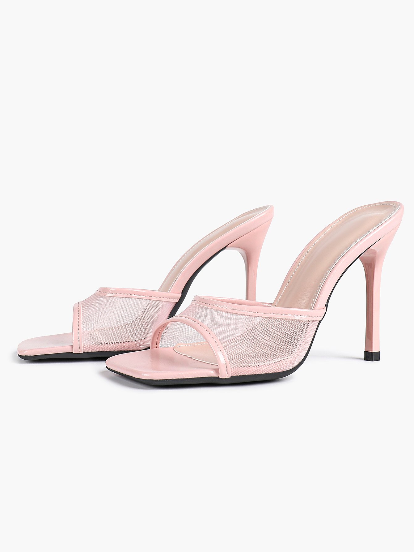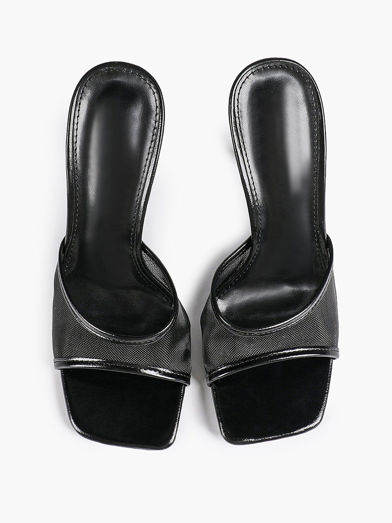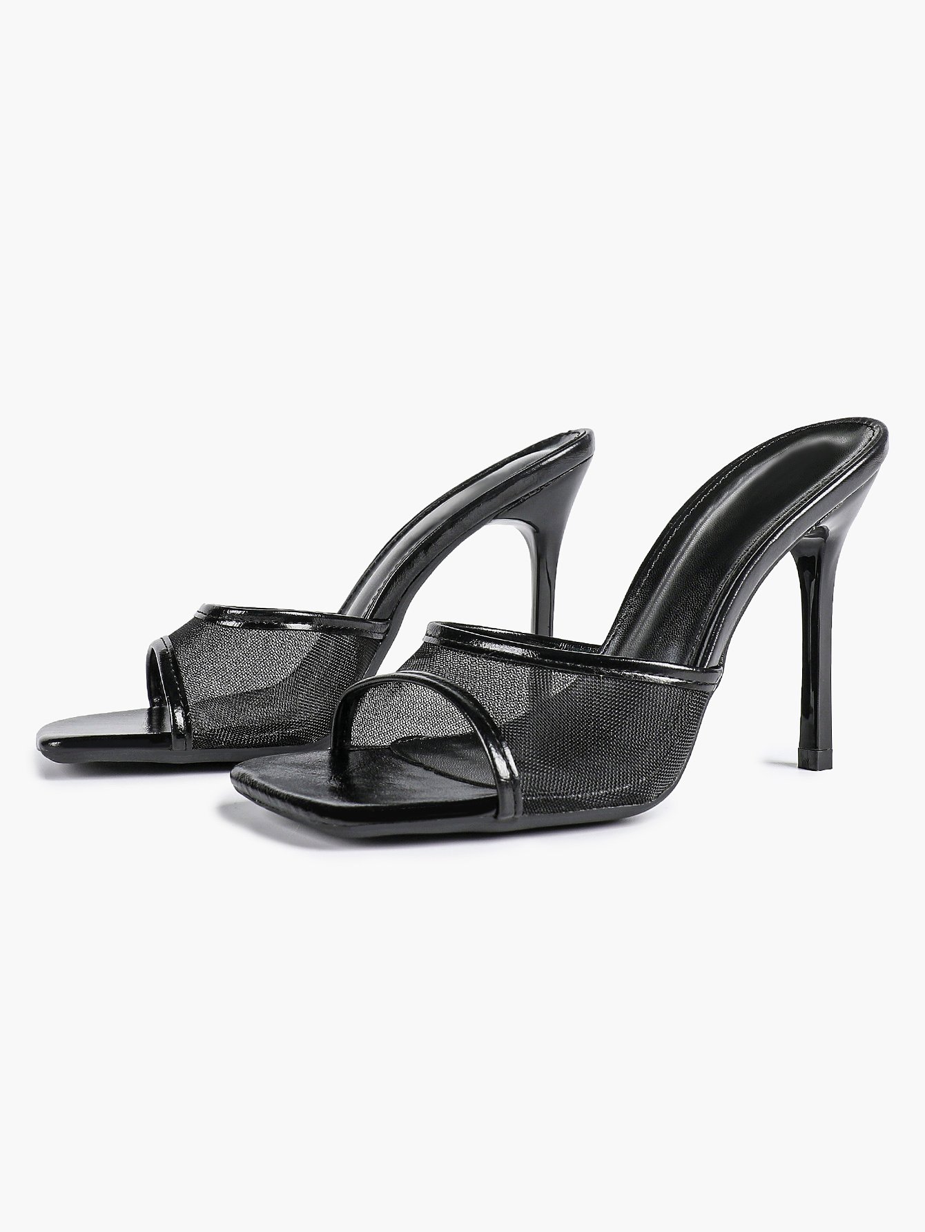 Women Patent & Transparent Mesh Mule Sandals – Square Toe Stiletto Heels