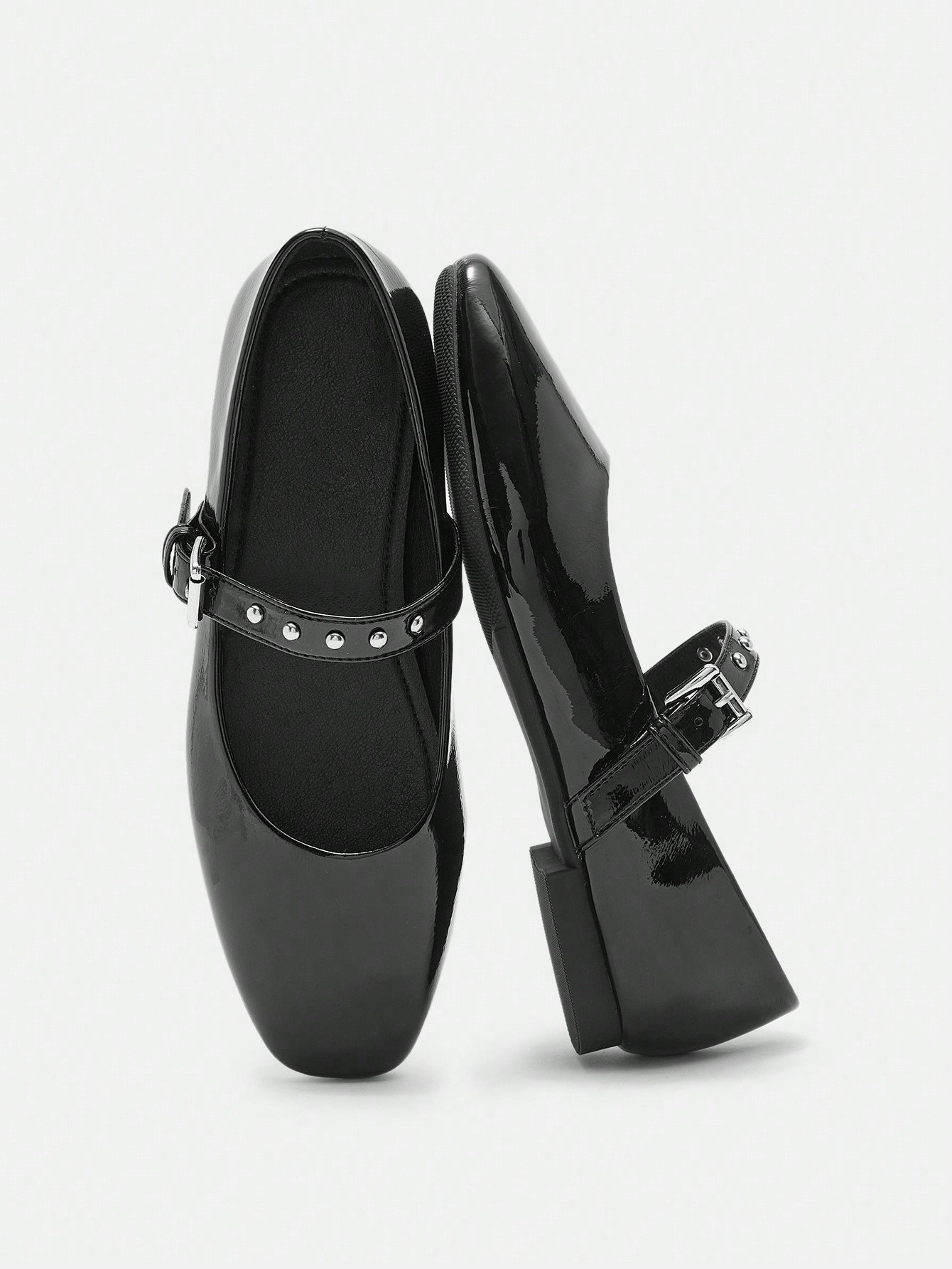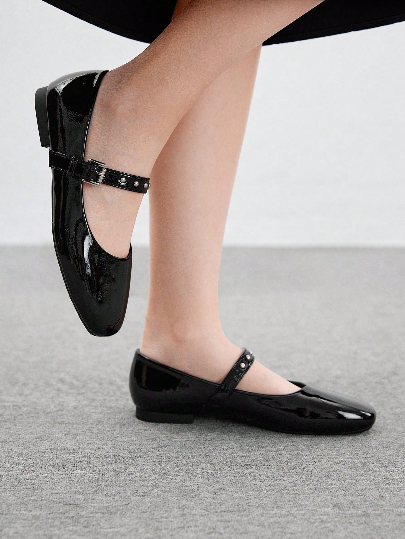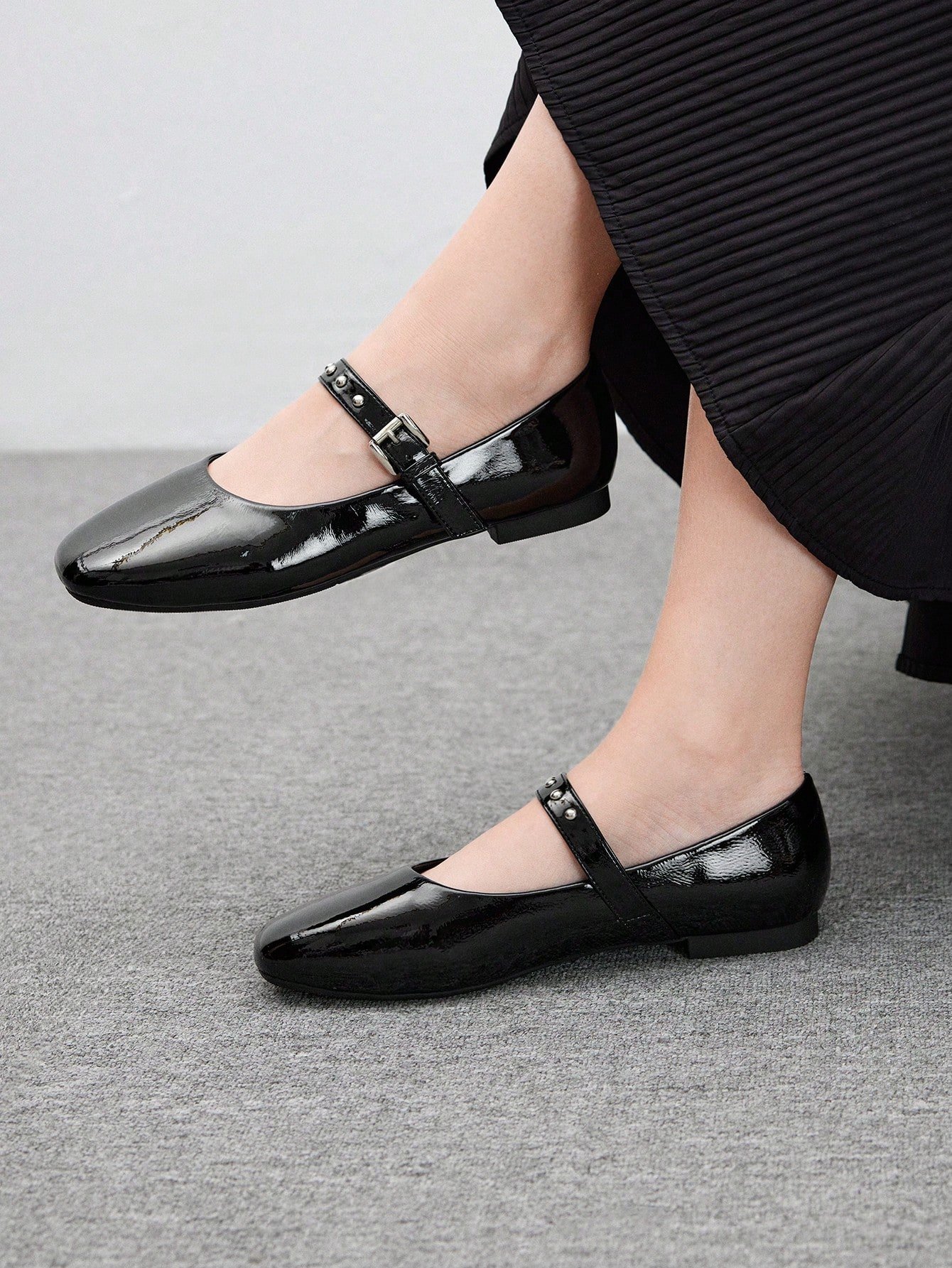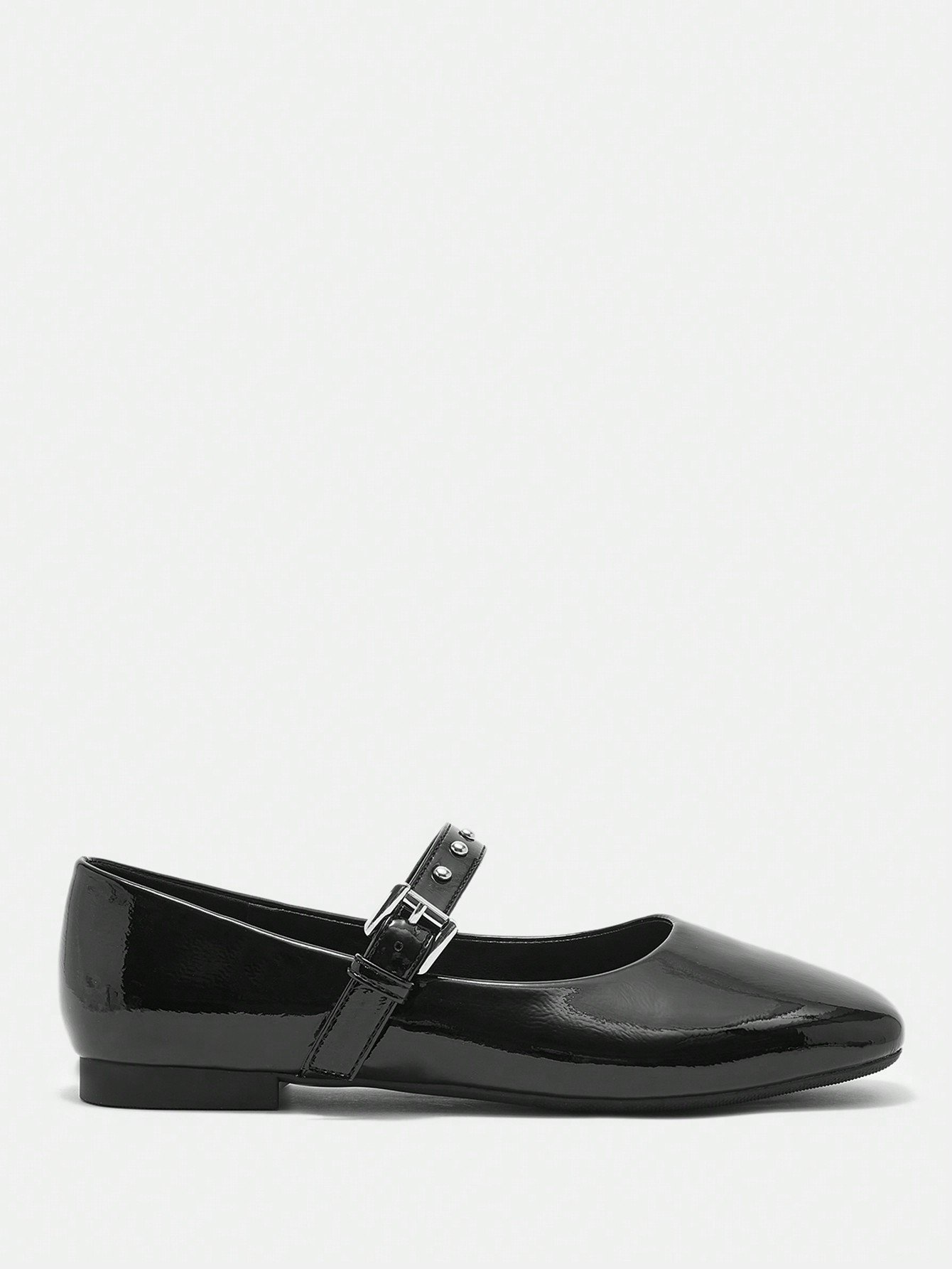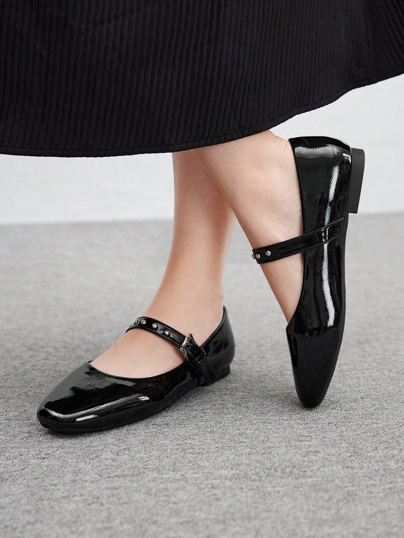 These black Mary Jane flats feature a classic round toe design, a sleek low heel, and adjustable laces with a polished buckle for a perfect fit.