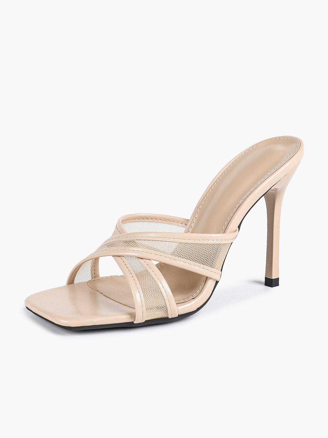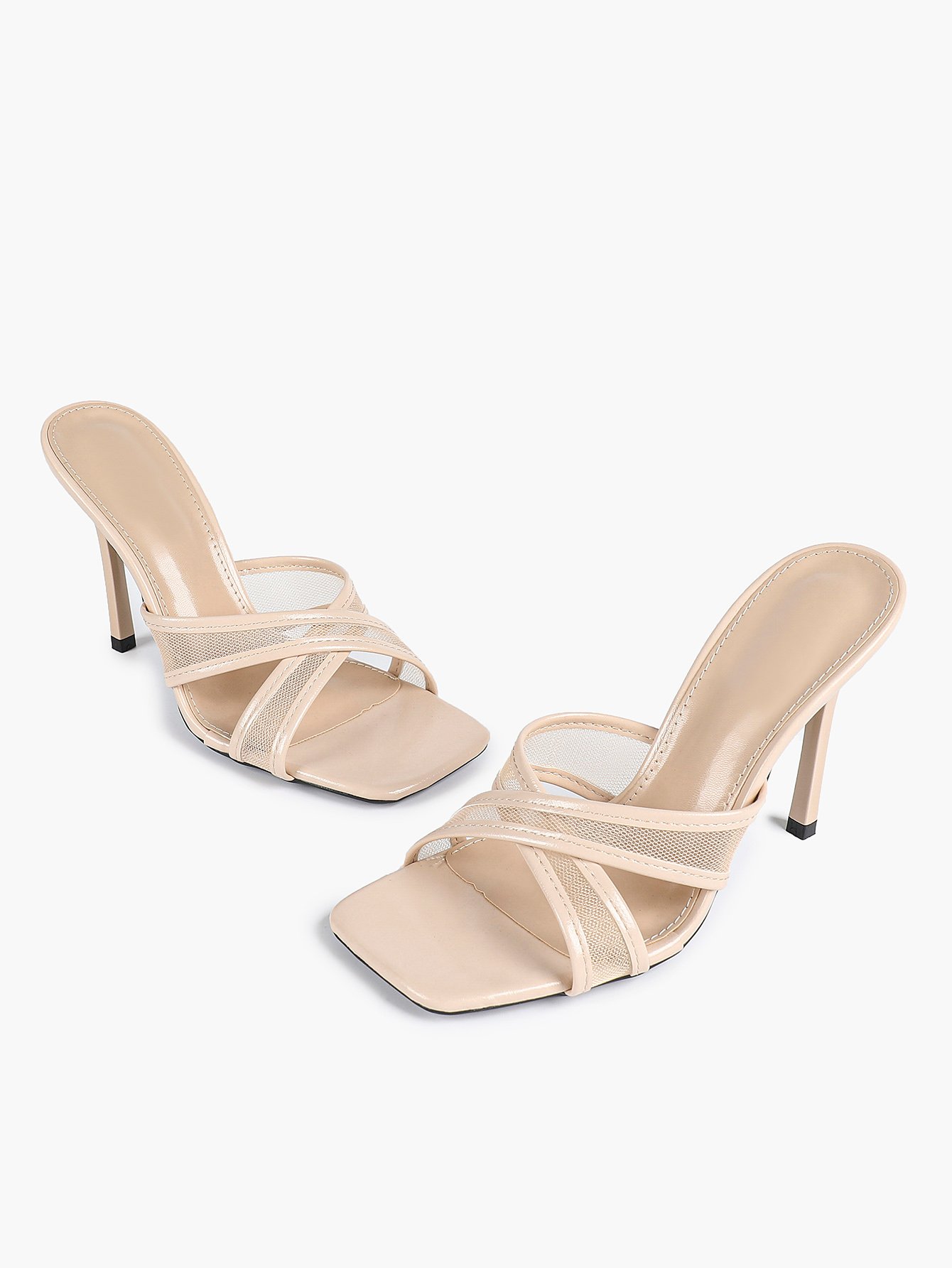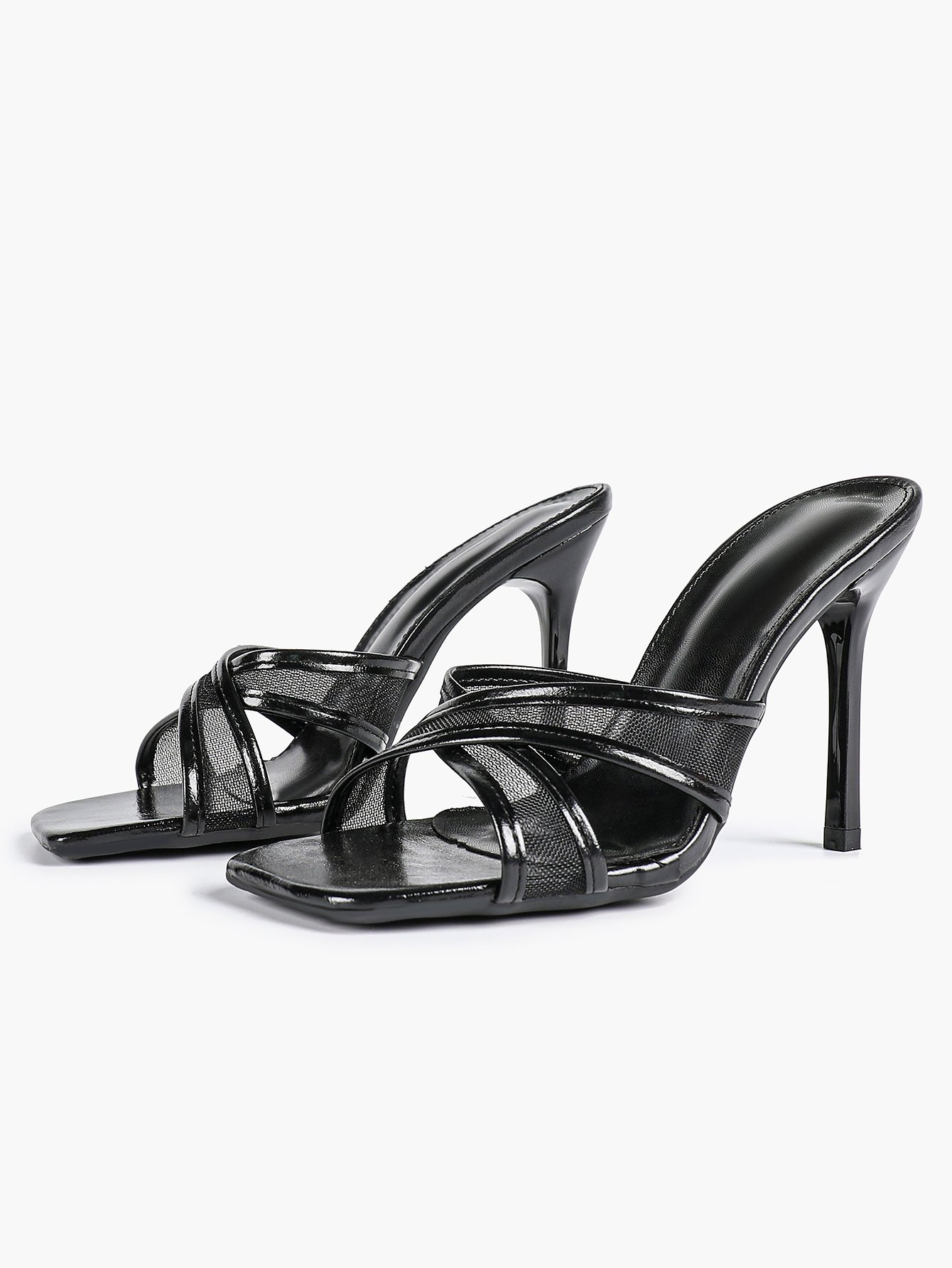 ✨ Step into sophistication with these patent and mesh stiletto sandals.
