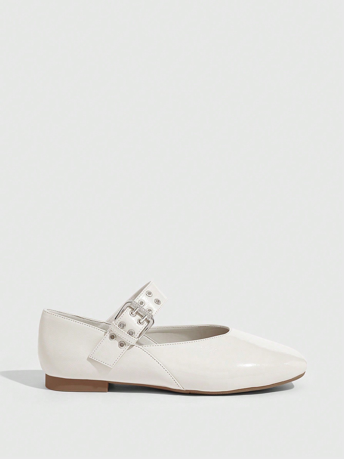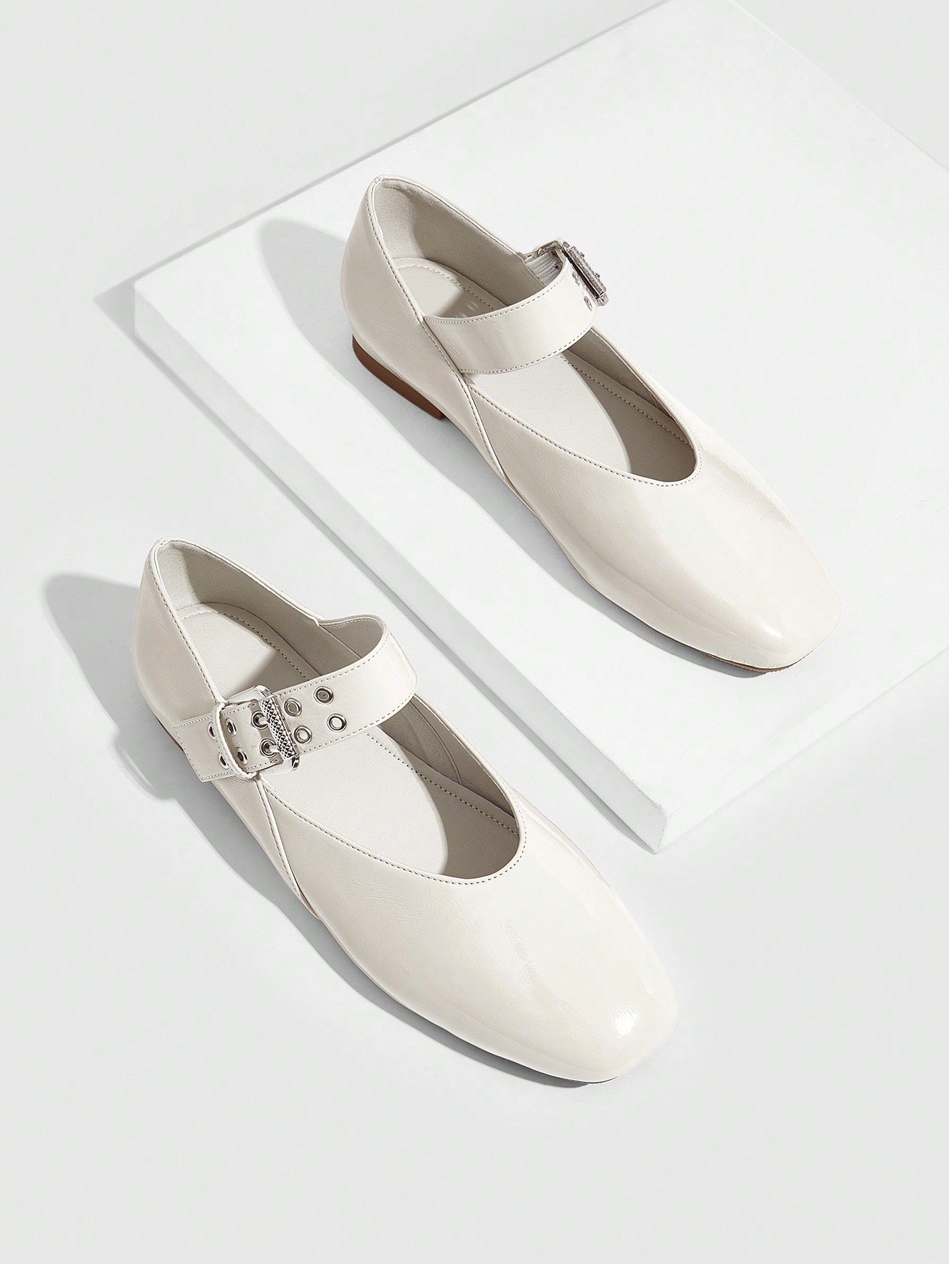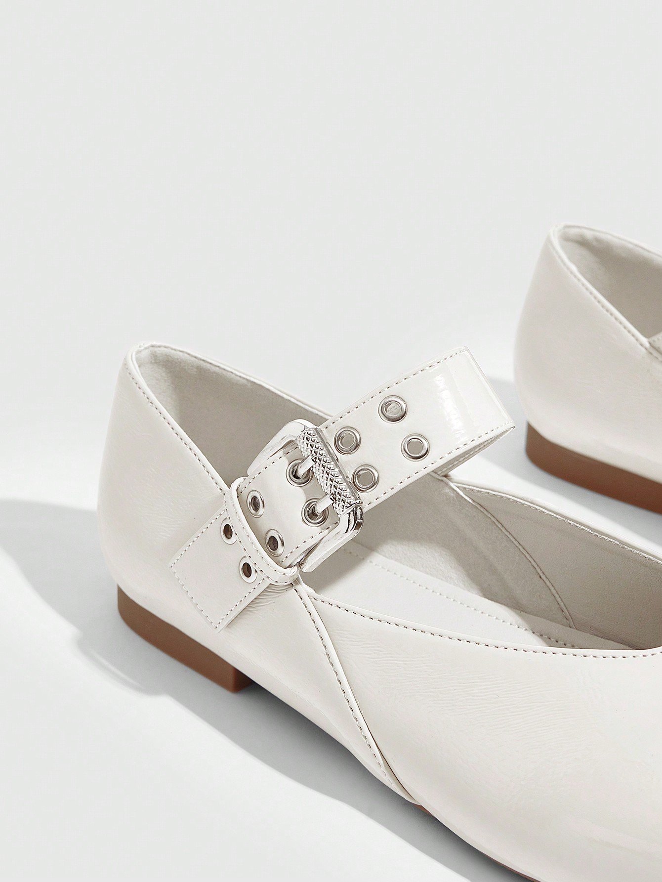 Women’s White Mary Jane Buckle Ballet Flats – Classic Round Toe Buckle Shoes, Vintage Style Vegan Leather