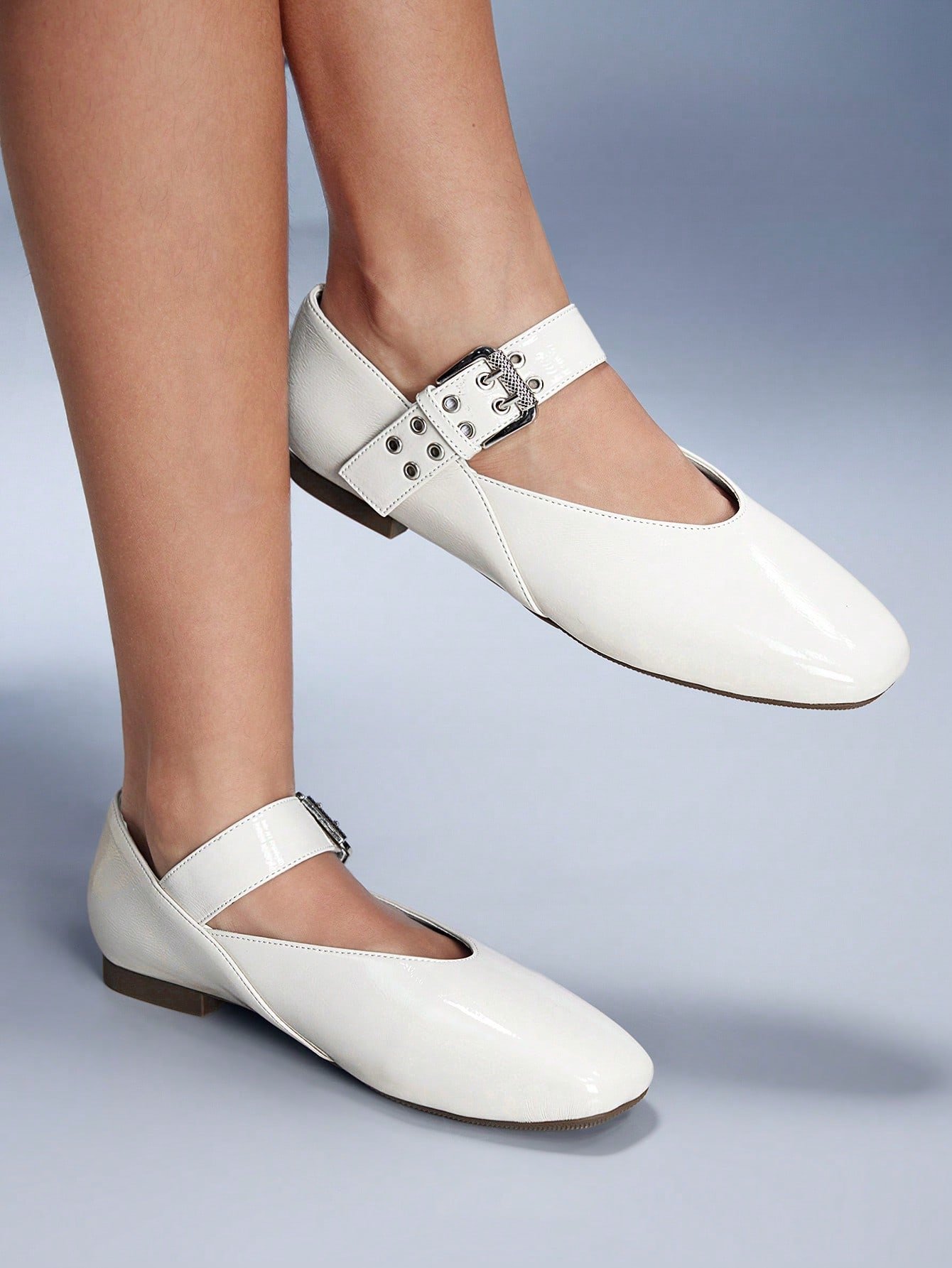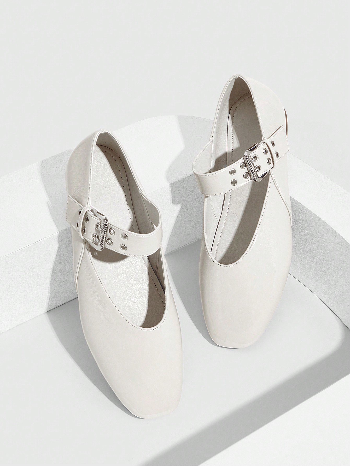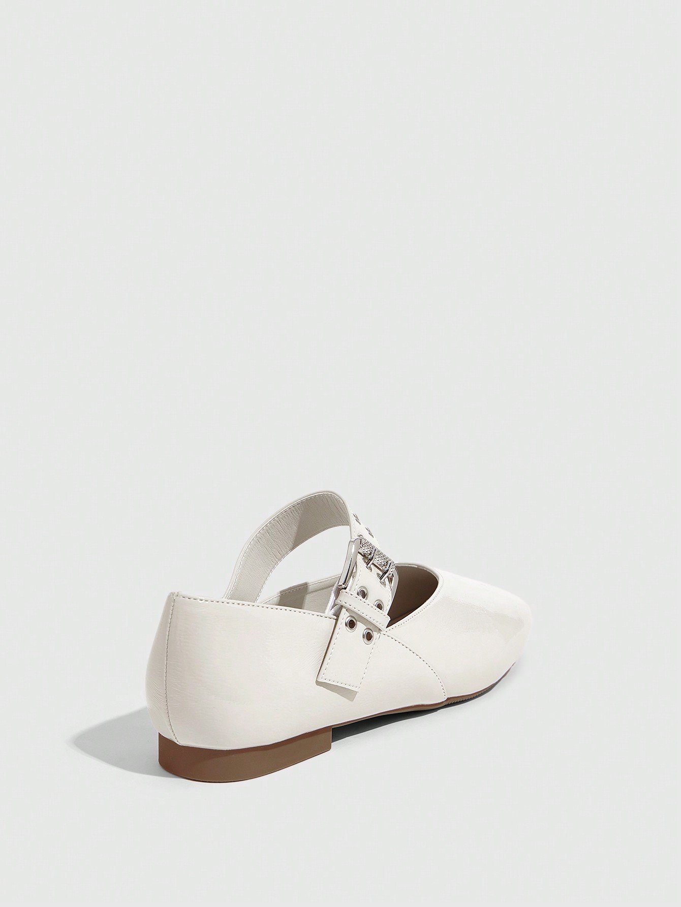 Women’s White Mary Jane Buckle Ballet Flats – Classic Round Toe Buckle Shoes, Vintage Style Vegan Leather